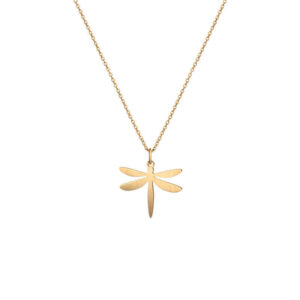 Colar Libelinha em prata dourada com acabamento mate. Fio de prata 925 com 42 cm ajustável aos 40 e 38 cm e pendente com cerca de 1,4 cm.